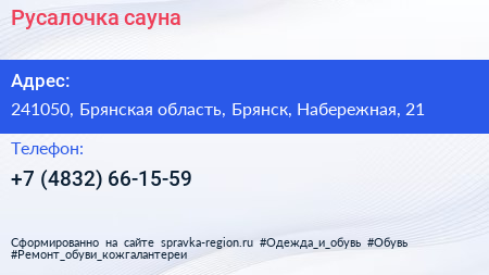 Русалочка, сауна по адресу 241050, Брянская область, Брянск, Набережная, 21 в дальнейшем Организация, размещена в следующих категориях: