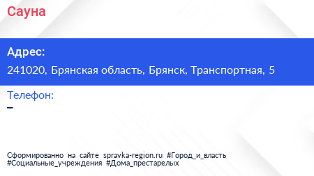 Сауна по адресу 241020, Брянская область, Брянск, Транспортная, 5 в дальнейшем Организация, размещена в следующих категориях: