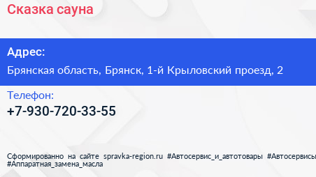 Сказка, сауна по адресу Брянская область, Брянск, 1-й Крыловский проезд, 2 в дальнейшем Организация, размещена в следующих категориях: