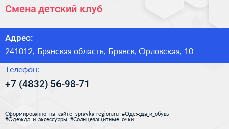 Смена, детский клуб по адресу 241012, Брянская область, Брянск, Орловская, 10 в дальнейшем Организация, размещена в следующих категориях: