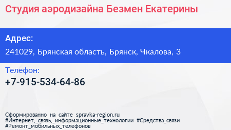 Студия аэродизайна Безмен Екатерины по адресу 241029, Брянская область, Брянск, Чкалова, 3 в дальнейшем Организация, размещена в следующих категориях: