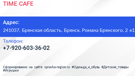 TIME CAFE по адресу 241037, Брянская область, Брянск, Романа Брянского, 2 к1 в дальнейшем Организация, размещена в следующих категориях: