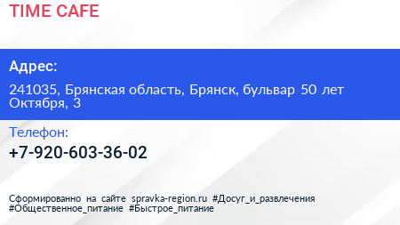 TIME CAFE по адресу 241035, Брянская область, Брянск, бульвар 50 лет Октября, 3 в дальнейшем Организация, размещена в следующих категориях: