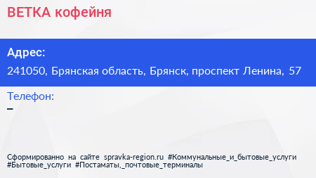 ВЕТКА, кофейня по адресу 241050, Брянская область, Брянск, проспект Ленина, 57 в дальнейшем Организация, размещена в следующих категориях: