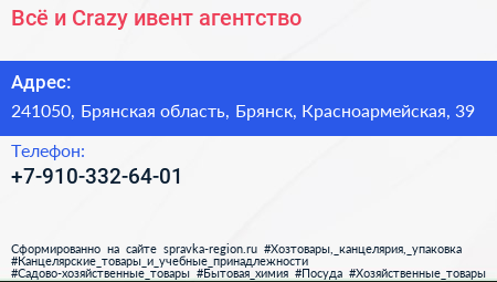Всё и Crazy, ивент-агентство по адресу 241050, Брянская область, Брянск, Красноармейская, 39 в дальнейшем Организация, размещена в следующих категориях: