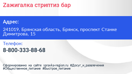 Zажигалка, стриптиз-бар по адресу 241019, Брянская область, Брянск, проспект Станке Димитрова, 15 в дальнейшем Организация, размещена в следующих категориях:
