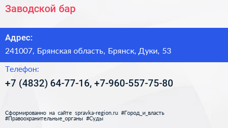 Заводской бар по адресу 241007, Брянская область, Брянск, Дуки, 53 в дальнейшем Организация, размещена в следующих категориях: