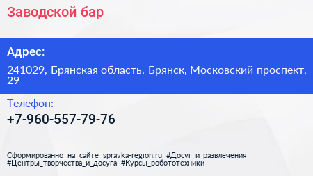 Заводской бар по адресу 241029, Брянская область, Брянск, Московский проспект, 29 в дальнейшем Организация, размещена в следующих категориях: