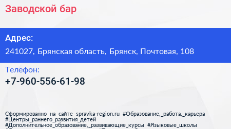 Заводской бар по адресу 241027, Брянская область, Брянск, Почтовая, 108 в дальнейшем Организация, размещена в следующих категориях: