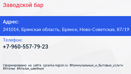 Заводской бар по адресу 241014, Брянская область, Брянск, Ново-Советская, 87/19 в дальнейшем Организация, размещена в следующих категориях: