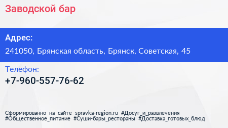 Заводской бар по адресу 241050, Брянская область, Брянск, Советская, 45 в дальнейшем Организация, размещена в следующих категориях: