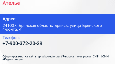 Ателье по адресу 241037, Брянская область, Брянск, улица Брянского Фронта, 4 в дальнейшем Организация, размещена в следующих категориях: