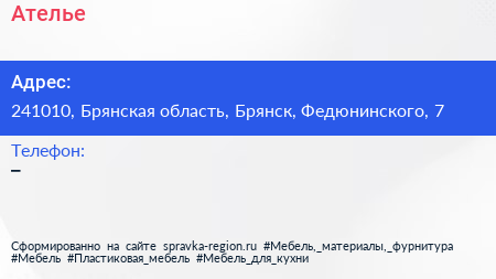 Ателье по адресу 241010, Брянская область, Брянск, Федюнинского, 7 в дальнейшем Организация, размещена в следующих категориях:
