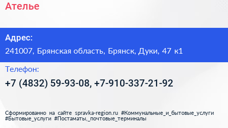 Ателье по адресу 241007, Брянская область, Брянск, Дуки, 47 к1 в дальнейшем Организация, размещена в следующих категориях: