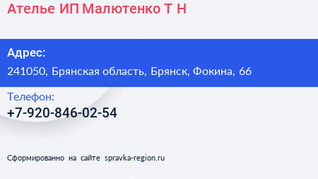 Ателье, ИП Малютенко Т. Н. по адресу 241050, Брянская область, Брянск, Фокина, 66 в дальнейшем Организация, размещена в следующих категориях:
