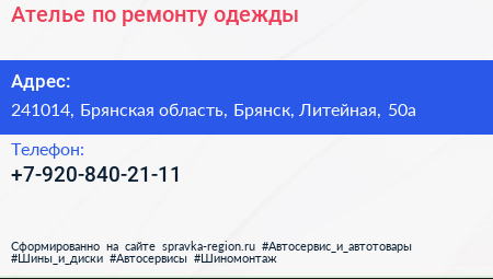 Ателье по ремонту одежды по адресу 241014, Брянская область, Брянск, Литейная, 50а в дальнейшем Организация, размещена в следующих категориях: