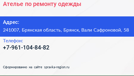 Ателье по ремонту одежды по адресу 241007, Брянская область, Брянск, Вали Сафроновой, 58 в дальнейшем Организация, размещена в следующих категориях:
