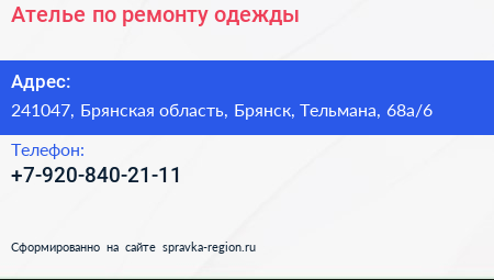 Ателье по ремонту одежды по адресу 241047, Брянская область, Брянск, Тельмана, 68а/6 в дальнейшем Организация, размещена в следующих категориях: