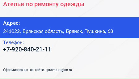 Ателье по ремонту одежды по адресу 241022, Брянская область, Брянск, Пушкина, 68 в дальнейшем Организация, размещена в следующих категориях: