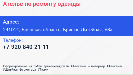 Ателье по ремонту одежды по адресу 241014, Брянская область, Брянск, Литейная, 68а в дальнейшем Организация, размещена в следующих категориях:
