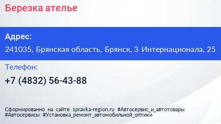 Березка, ателье по адресу 241035, Брянская область, Брянск, 3 Интернационала, 25 в дальнейшем Организация, размещена в следующих категориях: