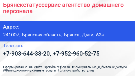 Брянскстатуссервис, агентство домашнего персонала по адресу 241007, Брянская область, Брянск, Дуки, 62а в дальнейшем Организация, размещена в следующих категориях: