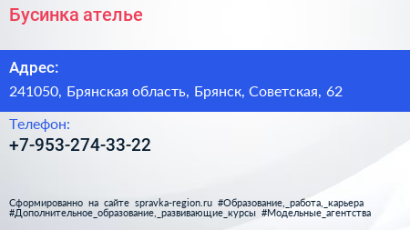 Бусинка, ателье по адресу 241050, Брянская область, Брянск, Советская, 62 в дальнейшем Организация, размещена в следующих категориях: