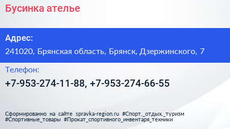 Бусинка, ателье по адресу 241020, Брянская область, Брянск, Дзержинского, 7 в дальнейшем Организация, размещена в следующих категориях: