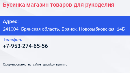 Бусинка, магазин товаров для рукоделия по адресу 241004, Брянская область, Брянск, Новозыбковская, 14Б в дальнейшем Организация, размещена в следующих категориях: