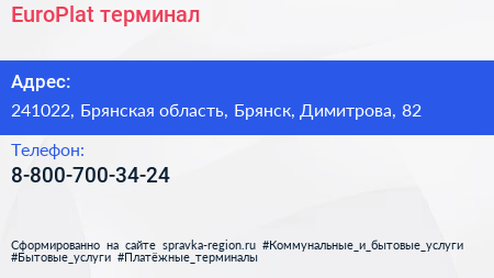 EuroPlat, терминал по адресу 241022, Брянская область, Брянск, Димитрова, 82 в дальнейшем Организация, размещена в следующих категориях: