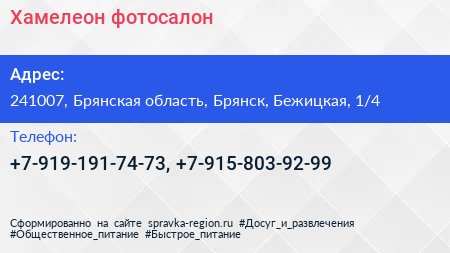Хамелеон, фотосалон по адресу 241007, Брянская область, Брянск, Бежицкая, 1/4 в дальнейшем Организация, размещена в следующих категориях: