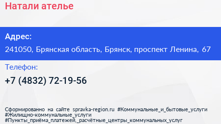 Натали, ателье по адресу 241050, Брянская область, Брянск, проспект Ленина, 67 в дальнейшем Организация, размещена в следующих категориях: