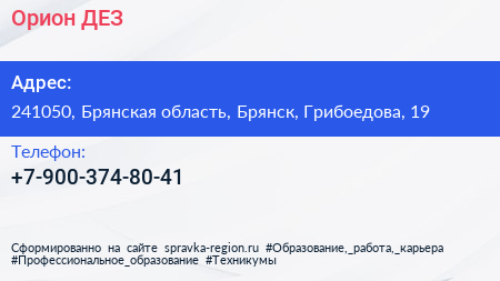 Орион ДЕЗ по адресу 241050, Брянская область, Брянск, Грибоедова, 19 в дальнейшем Организация, размещена в следующих категориях: