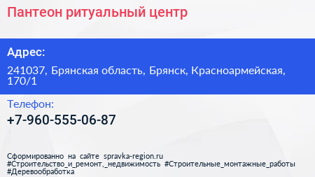 Пантеон, ритуальный центр по адресу 241037, Брянская область, Брянск, Красноармейская, 170/1 в дальнейшем Организация, размещена в следующих категориях: