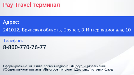 Pay.Travel, терминал по адресу 241012, Брянская область, Брянск, 3 Интернационала, 10 в дальнейшем Организация, размещена в следующих категориях: