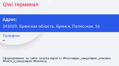 Qiwi, терминал по адресу 241029, Брянская область, Брянск, Полесская, 16 в дальнейшем Организация, размещена в следующих категориях: