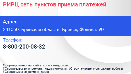 РИРЦ, сеть пунктов приема платежей по адресу 241050, Брянская область, Брянск, Фокина, 90 в дальнейшем Организация, размещена в следующих категориях: