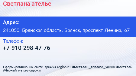 Светлана, ателье по адресу 241050, Брянская область, Брянск, проспект Ленина, 67 в дальнейшем Организация, размещена в следующих категориях: