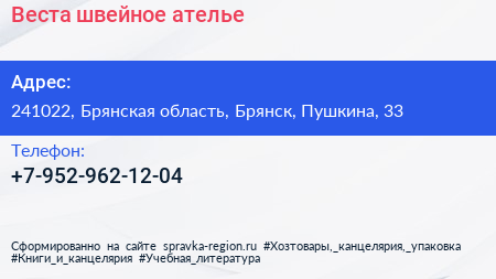 Веста, швейное ателье по адресу 241022, Брянская область, Брянск, Пушкина, 33 в дальнейшем Организация, размещена в следующих категориях:
