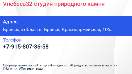Vнебеса32, студия природного камня по адресу Брянская область, Брянск, Красноармейская, 105а в дальнейшем Организация, размещена в следующих категориях: