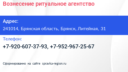 Вознесение, ритуальное агентство по адресу 241014, Брянская область, Брянск, Литейная, 31 в дальнейшем Организация, размещена в следующих категориях: