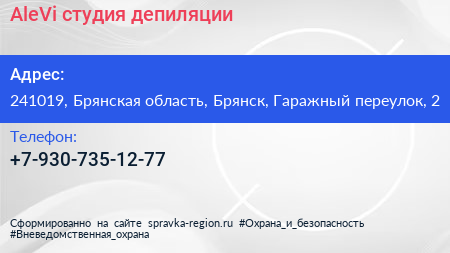 AleVi, студия депиляции по адресу 241019, Брянская область, Брянск, Гаражный переулок, 2 в дальнейшем Организация, размещена в следующих категориях:
