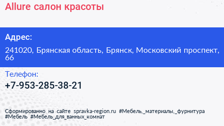 Allure, салон красоты по адресу 241020, Брянская область, Брянск, Московский проспект, 66 в дальнейшем Организация, размещена в следующих категориях: