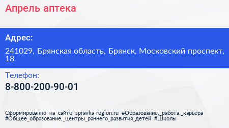 Апрель, аптека по адресу 241029, Брянская область, Брянск, Московский проспект, 18 в дальнейшем Организация, размещена в следующих категориях:
