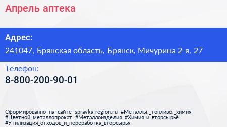 Апрель, аптека по адресу 241047, Брянская область, Брянск, Мичурина 2-я, 27 в дальнейшем Организация, размещена в следующих категориях: