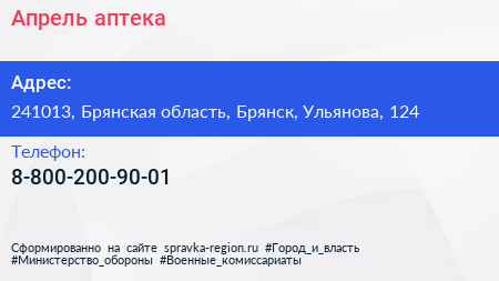 Апрель, аптека по адресу 241013, Брянская область, Брянск, Ульянова, 124 в дальнейшем Организация, размещена в следующих категориях: