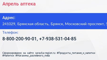 Апрель, аптека по адресу 241029, Брянская область, Брянск, Московский проспект, 5 в дальнейшем Организация, размещена в следующих категориях: