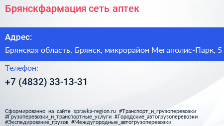 Брянскфармация, сеть аптек по адресу Брянская область, Брянск, микрорайон Мегаполис-Парк, 5 в дальнейшем Организация, размещена в следующих категориях: