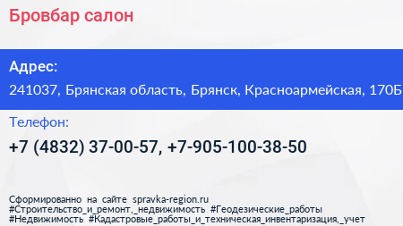 Бровбар, салон по адресу 241037, Брянская область, Брянск, Красноармейская, 170Б в дальнейшем Организация, размещена в следующих категориях: