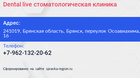 Dental live, стоматологическая клиника по адресу 241019, Брянская область, Брянск, переулок Осоавиахима, 16 в дальнейшем Организация, размещена в следующих категориях: